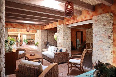 • Bright, open spaces, including a reception hall, a main dining room with large windows that open to a terrace overlooking the garden, and two living rooms (main and sitting room).