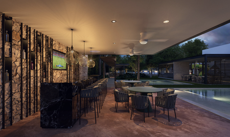 Terraza junto a la alberca con barra y baño completo
