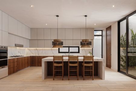 Cocina con carpintería inferior y superior, mesetas de cuarzo equipada con horno, parrilla y campana