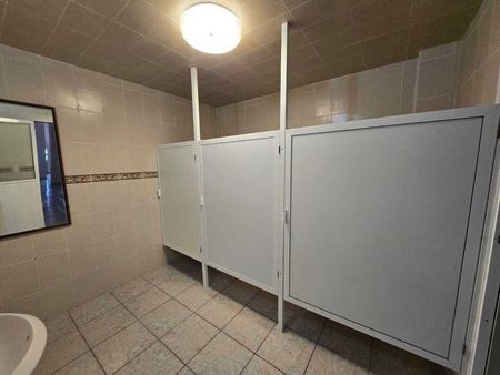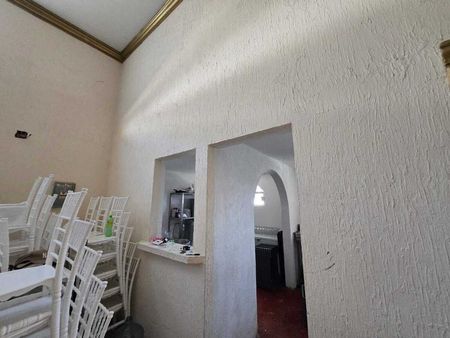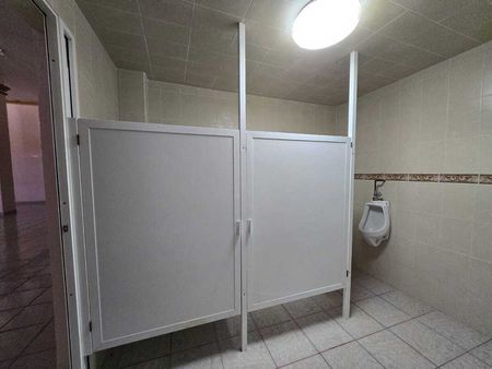 El salón mide 12 de ancho por 24 de largo, altura 4.50m. Cuenta con baños hombre y mujer.