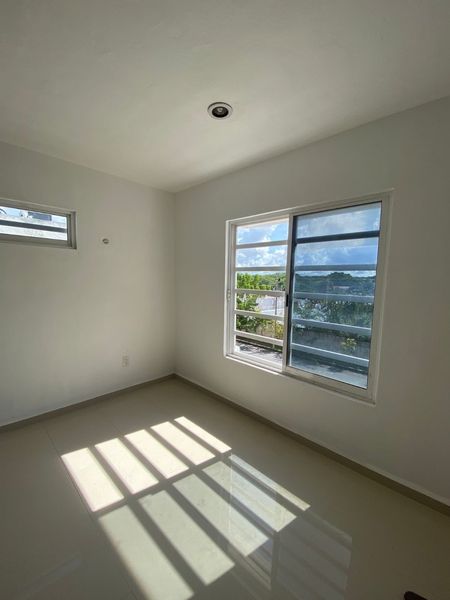 La casa cuenta con dos plantas, en planta baja sala comedor, cocina con meseta de granito, estufa y refrigerador; bodega/alacena, recámara con baño propio, ventilador y aire acondicionado; y patio.