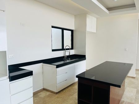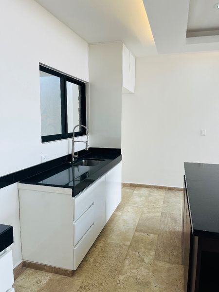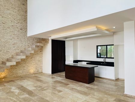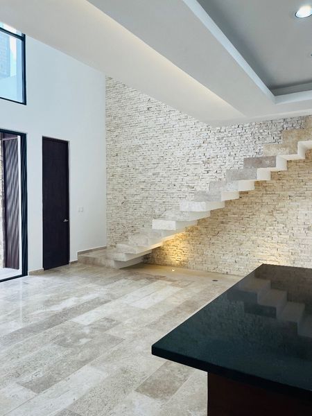 Cuenta con amplio estacionamiento, con espacio para 4 autos, al menos dos bajo techo, entrada a pasillo y área de servicio, entrada principal, que lleva a un espacio con doble altura donde conviven las áreas de sala, comedor y cocina, con techos de gran altura, la cocina con concepto abierto, buen espacio para refrigerador, alacena con puerta corrediza, gavetas superiores e inferiores, espacio para estufa, y una isla que se presta perfectamente para poder estar siempre en contacto con quienes le acompañen el el área de sala y comedor.