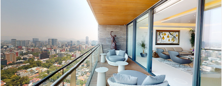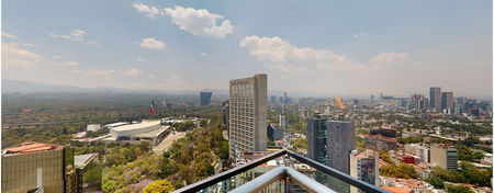 La sala/comedor, con puertas de vidrio corredizas, te brinda una de las mejores vistas de la CDMX con acceso a una generosa terraza y un espacio para bar encantador.