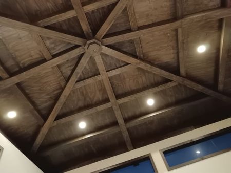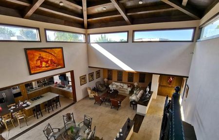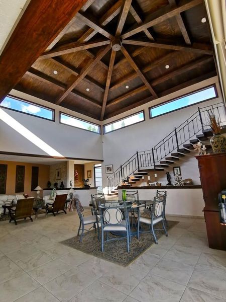 Sala y comedor amplios de doble altura con domo de madera de pino natural