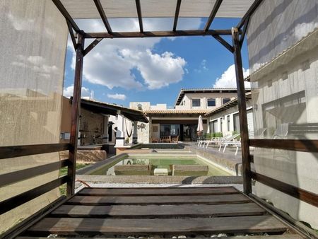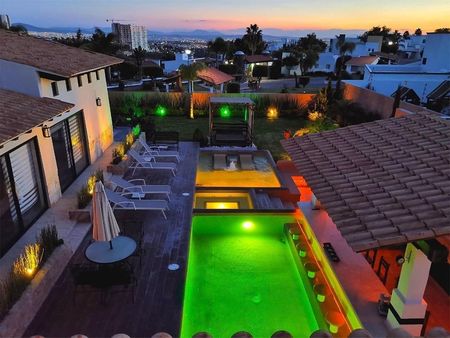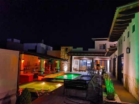 Área social de 300m2, jardín, la alberca con el jacuzzi con turbinas , asoleadero con camastros , fire pit, un bar con tv y para música , área de asador , la sensación de estar en un hotel boutique