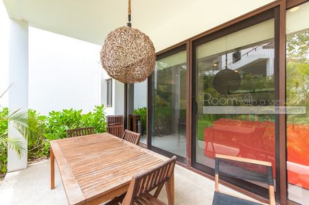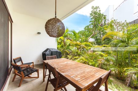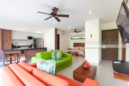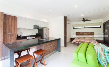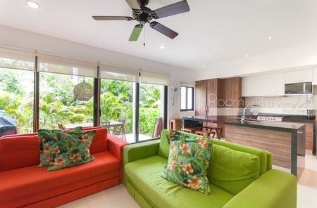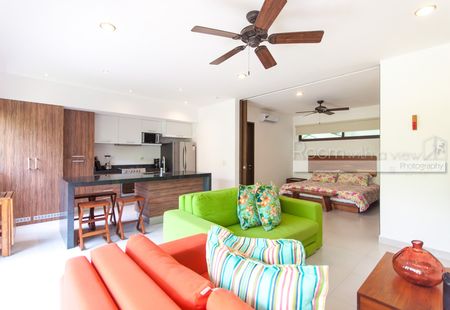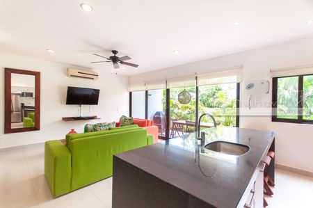 Este departamento de 1 recámara en planta baja tiene todo lo que podría desear en una propiedad vacacional o residencia de tiempo completo. Ofrece una amplia distribución abierta que recibe abundante luz caribeña. Cuenta con cocina completamente equipada con isla y una sala de estar llena de luz natural que se abre a una terraza cubierta, perfecta para disfrutar de su café de la mañana o una copa de vino por la noche. El amplio espacio de almacenamiento en la cocina y el closet en la recámara hacen que este espacio sea cómodo para la vida diaria y perfecto para sus huéspedes de vacaciones. Este departamento brilla con pisos de azulejo y acabados de alta calidad. Se ofrece a la venta completamente amueblado y ambos sofás son sofás cama para espacio adicional para dormir. La mesa exterior se completa con 6 sillas al aire libre y la unidad está equipada con ventiladores de techo, aire acondicionado y una lavadora y secadora.