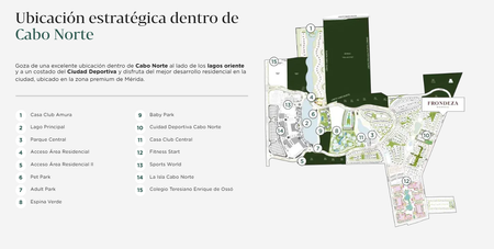 Cabo Norte ubicado al norte de la Ciudad de Mérida en el cual se incerta la PRIVADA FRONDEZA, tiene una dimensión total de 160 hectáreas, más de 15 Privadas, más de 10 Amenidades, 100,000 m² con lagos espectaculares, 5 km de andadores verdes diseñados para hacer deporte, más de 200,000 m² de áreas verdes, jardines y parques.