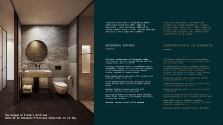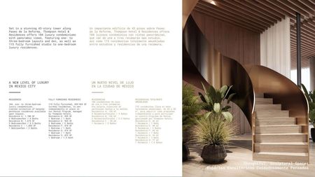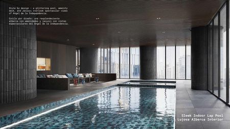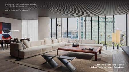 Vistas Panorámicas: Cada uno de los 104 condominios de lujo y 115 residencias completamente amuebladas cuenta con amplias fachadas de vidrio y muros cortina, proporcionando vistas despejadas del horizonte de la Ciudad de México.