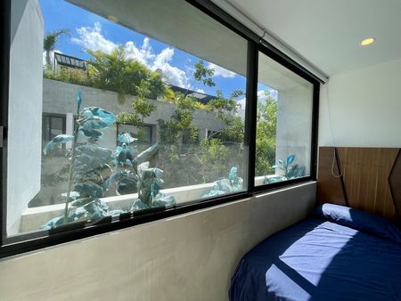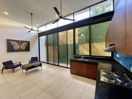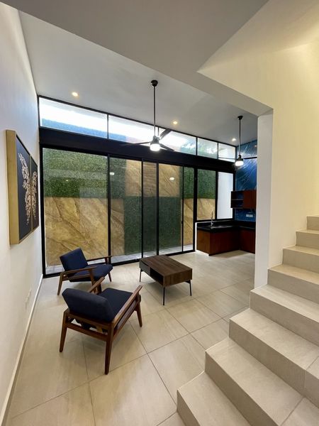 La vegetación es parte importante del conjunto y una vez entrando encontraras madera, granito, sala - comedor - cocina a doble altura. Un jardín posterior con muro decorado en estuco y muro verde, tras un gran ventanal. Equipada con sala, comedor, cocina vestida, parrilla eléctrica, aire acondicionado , ventiladores y área de lavadería techada.