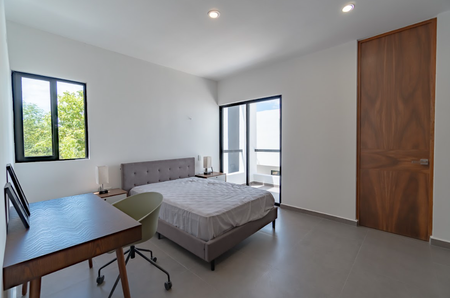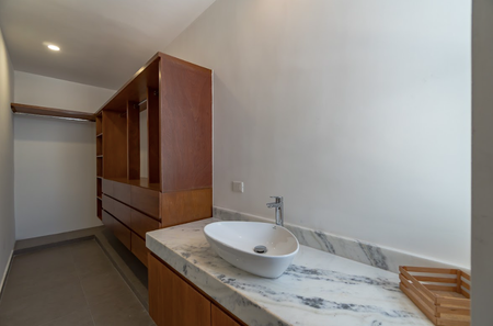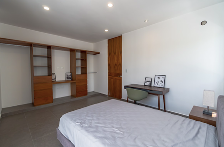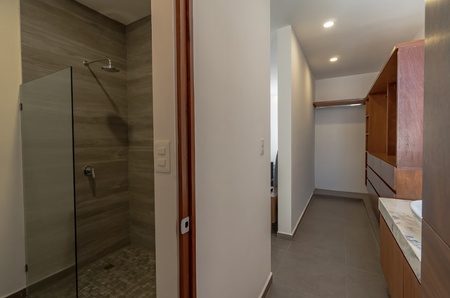 Recámara principal con closet vestidor y baño