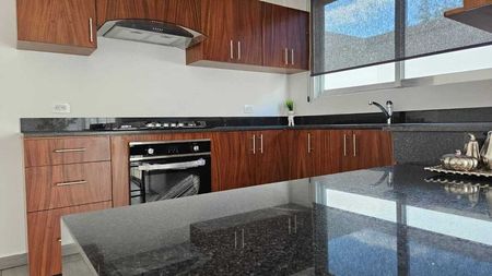 • Cocina hecha con madera de Parota cubierta en granito color negro, muebles abajo y arriba, equipada con Horno; Parrilla de 5 quemadores de gas, así como campana extractora de olores.