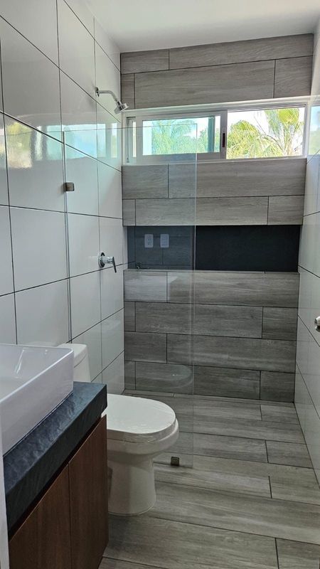 • Baño totalmente vestido en lozas de 90 x 25, y mesetas color negro que incluye muebles bajos.