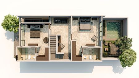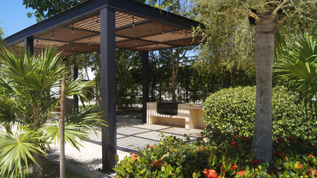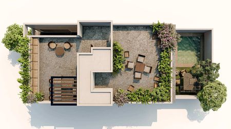 •Piscina con acabado chukum, lámpara sumergible y preparación para sistema de riego.
