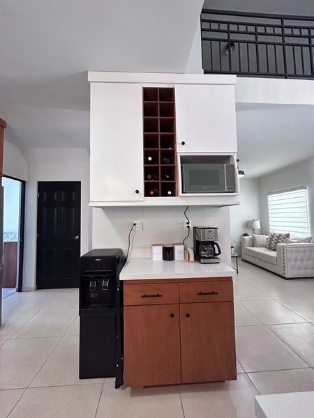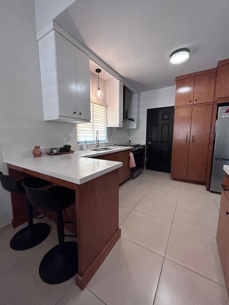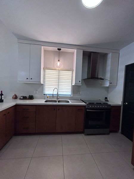 Cocina con encimera de cuarzo, equipada con estufa, campana.