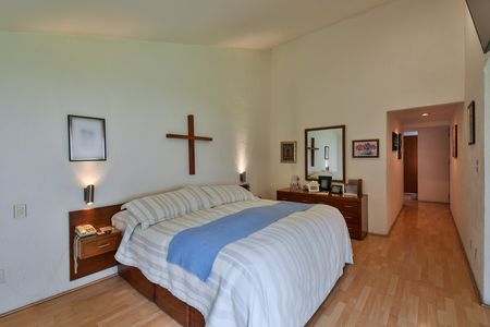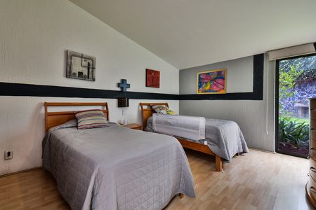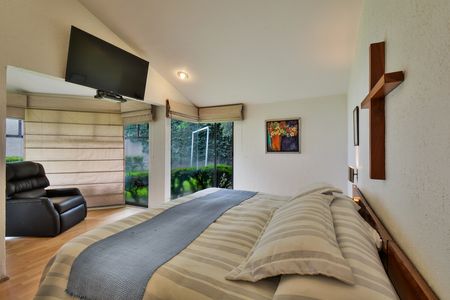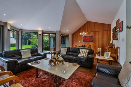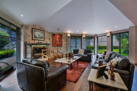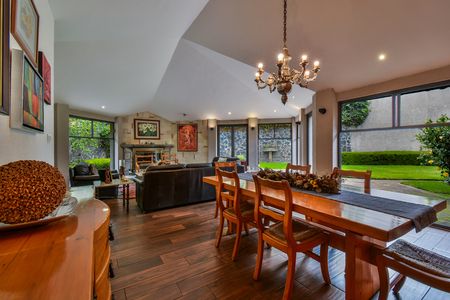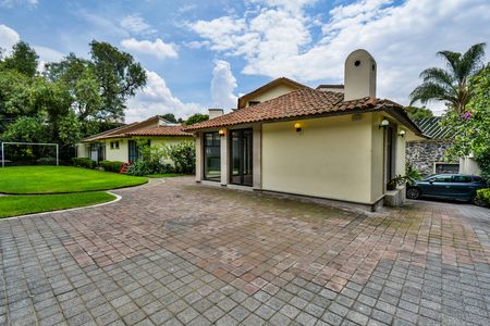 EN CALLE CERRADA CON VIGILANCIA Y DESARROLLADA EN UNA SOLA PLANTA, con precioso jardín que disfrutas desde cualquier zona de la casa. Disfruta del gran confort que te brinda esta casa con excelente distribución y ventanales de piso a techo que permiten una excelente iluminación natural. Cuenta con gran sala con chimenea, comedor, acogedora sala de tv, 3 recámaras cada una con baño y la principal con vestidor, y un estudio que se encuentra en el primer nivel. Tiene estacionamiento para 3 autos dentro de la casa y 6 más en la calle.