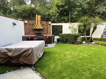 - Jardín con terraza techada, asador, jacuzzi, fuente y bodega.