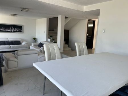 La sala y el comedor son amplios y muy iluminados, con grandes ventanales que conducen a una terraza con vista espectacular. Desde la terraza se accede al jardín trasero, un espacio ideal para reuniones, ya que cuenta con baño, bodega y una tarja, perfecta para cuando se organizan carnes asadas o convivencias familiares.