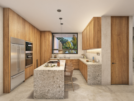 La sencillez y elegancia definen a Carmela . Sus diseñadores la dotaron con un corazón de cemento pulido tan fino que puede albergar un hogar entero .