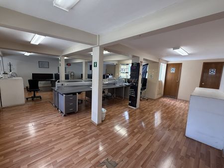 Planta baja: Oficina principal con medio baño integrado, recepción, sala de juntas, 2 privados adicionales (uno con medio baño).