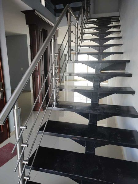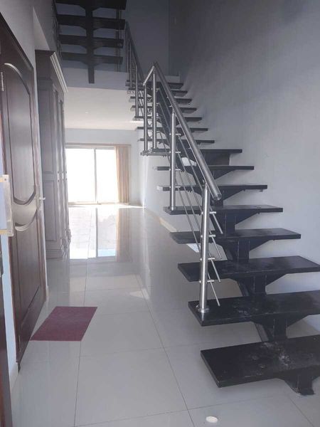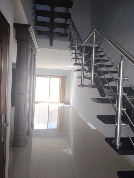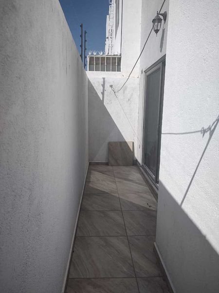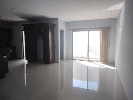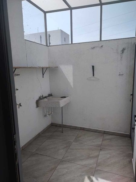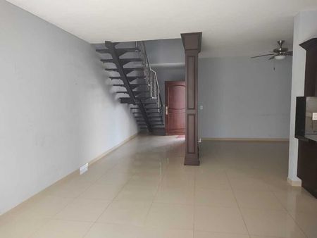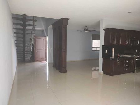 Planta baja: sala comedor, cocina equipada, medio baño, área de lavado techado, patio, cochera para dos carros, doble altura