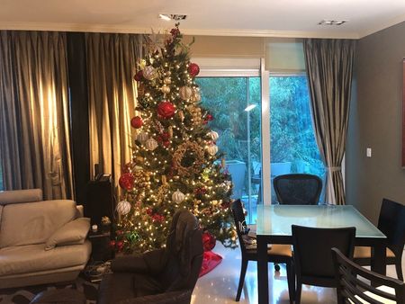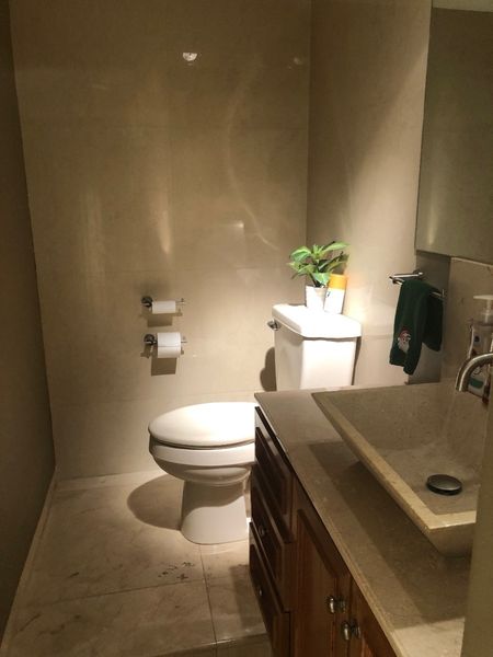 Recibidor, 2 medios baños con lavabos de mármol, área de sala - comedor con ventanales de piso a techo que permite entrar la luz natural del día, terraza con vista al jardín del complejo. Hay un espacio en el área social con ventanal de piso a techo que se puede acondicionar como bar, estancia familiar , área de juego.
