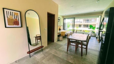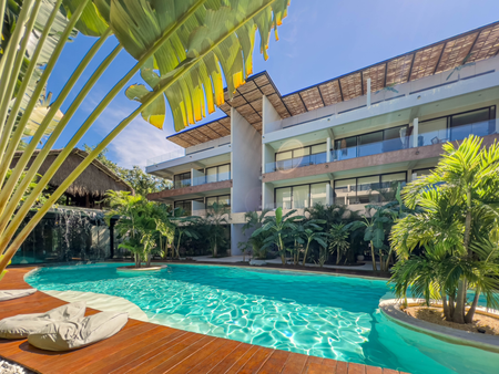 , espaciosas áreas verdes y una gran alberca central con cascada complementando el paisaje tropical de las áreas comunes, este lugar te ofrece una excelente ubicación, rodeado de naturaleza