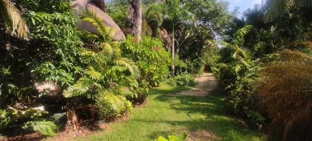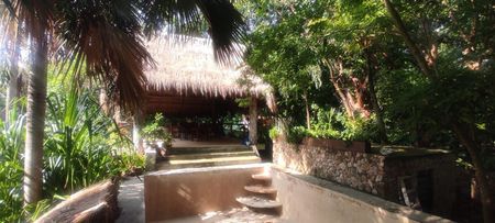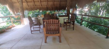2. CASA PRINCIPAL, con terraza techada de huano; cuenta con sala, comedor, cocina con alacena, 2 Recámaras amplias con sus propios baños, y 1 medio baño