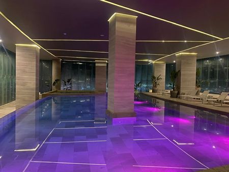 Alberca interior en el nivel 20: Una piscina cubierta con vistas espectaculares desde el piso 20.