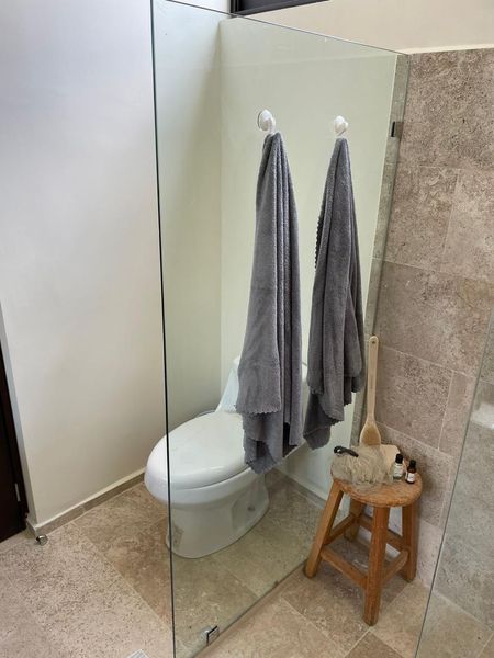 Baño completo con espejo y cancel de vidrio templado en area regadera, se comparte con visitas