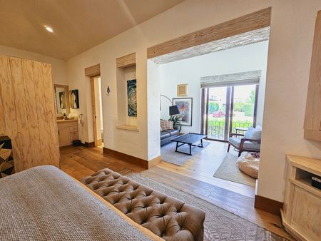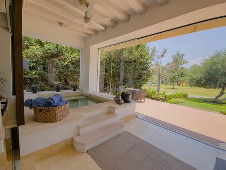 El jardín amplio con áreas verdes bien cuidadas, una terraza ideal para reuniones y comidas al aire libre, y una elegante jacuzzi con área de descanso forman parte de los exteriores de la propiedad. La cochera techada tiene espacio para 2 vehículos.