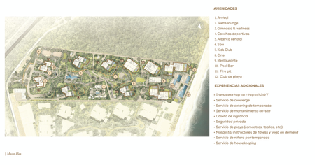 Servicios adicionales: concierge, transporte interno 24/7, servicio de playa, niñera por temporada, instructores de fitness/yoga on demand, y housekeeping. Concepto de vida