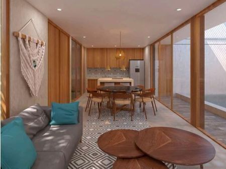 También hay una habitación con baño completo en la planta baja, área de lavado, garaje techado para dos vehículos, una terraza y una piscina privada para disfrutar del sol y la