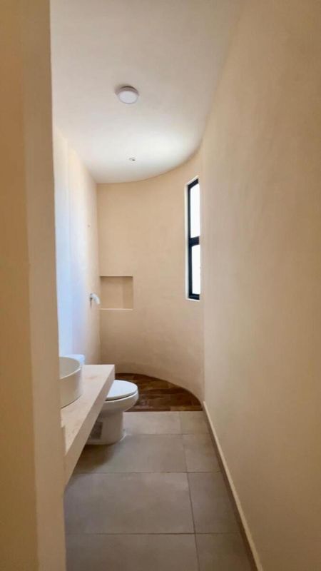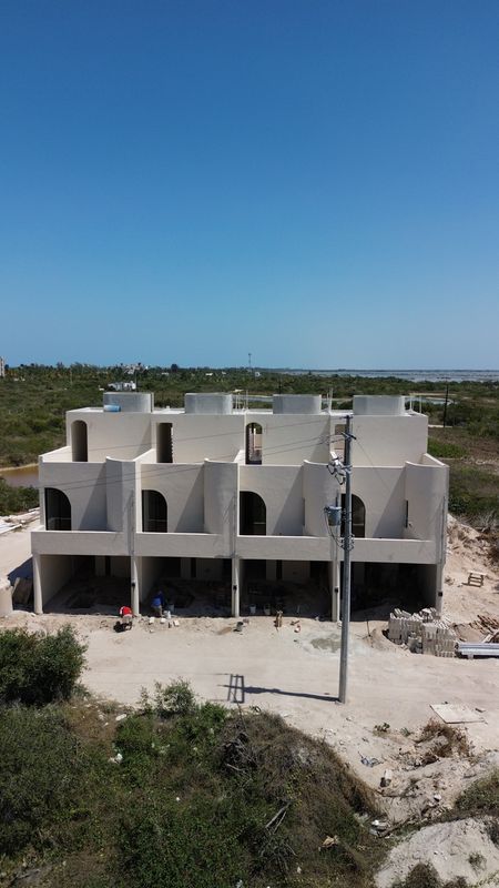 La estructura de la vivienda se confirma de muertos de concreto y losas de vigueta y bovedilla con acabados de cemento y polvo en interiores y exteriores para una mayor durabilidad extra en la playa, con pisos de 45 x 90 en color gris, mesetas de mármol crema maya, puertas de Tzalam, aluminio de 6 mm, tipo de madera y cubiertas de granito en cocina.